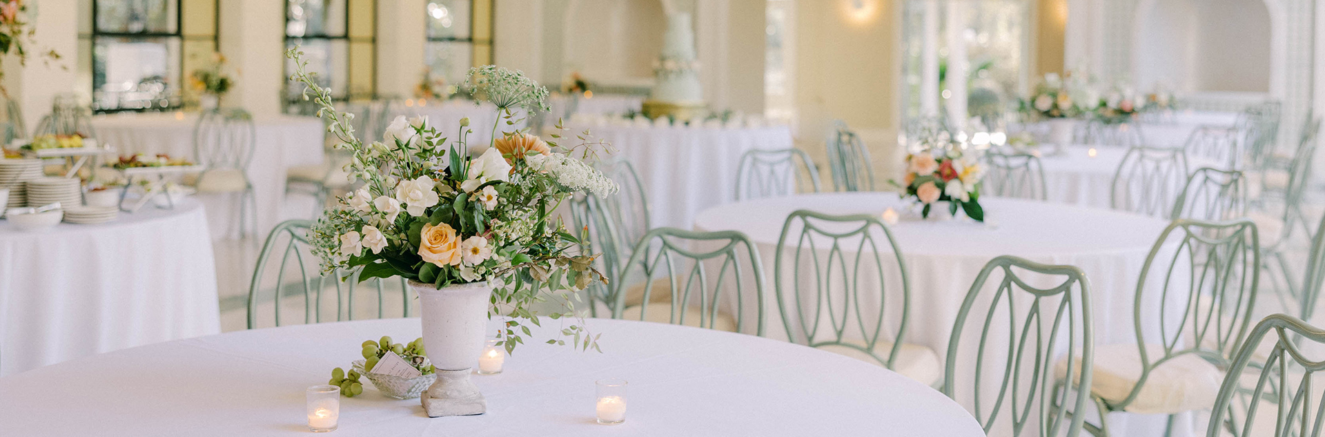 The timeless Southern elegance of the Grand Oaks Ballroom is the perfect backdrop to your wedding ceremony or reception. Featuring floor-to-ceiling windows, Italian marble floors, and hand-painted murals by Grahame Menage, the natural beauty of The Greenwood is reflected in every lovely detail.